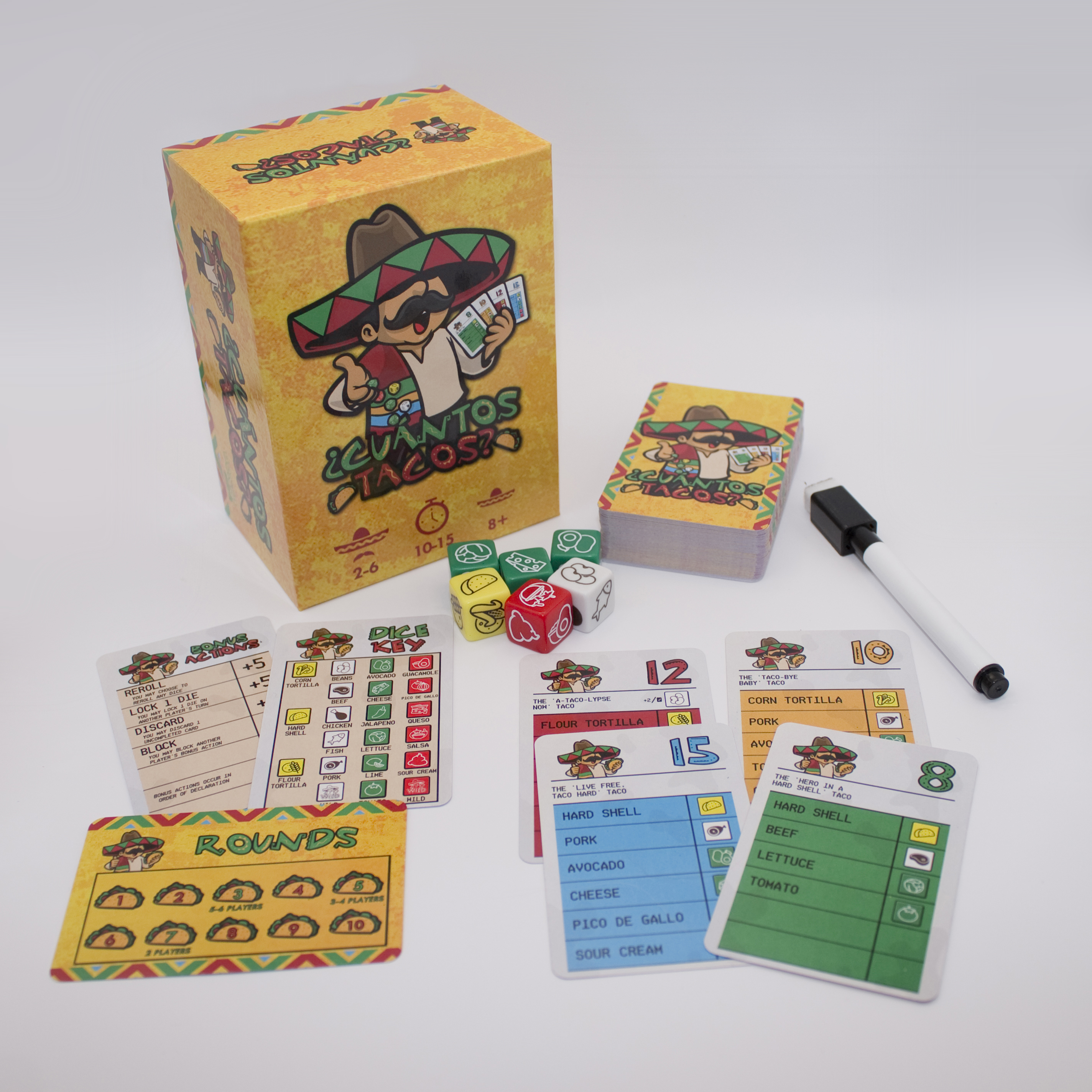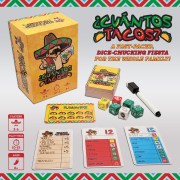 In ¿Cuántos Tacos?, your goal is to complete taco orders worth various points. One player rolls six dice which represent tortillas, proteins, toppings, and sauces. That player may keep or re-roll as many of the dice as they see fit to fulfill their orders. Everyone else at the table must use the same die combinations to complete their tacos as well. Play continues through a pre-determined number of rounds with some bonus actions included such as re-rolling or locking dice on other players’ turns, canceling someone else’s bonus actions, or discarding an incomplete card before the game ends.